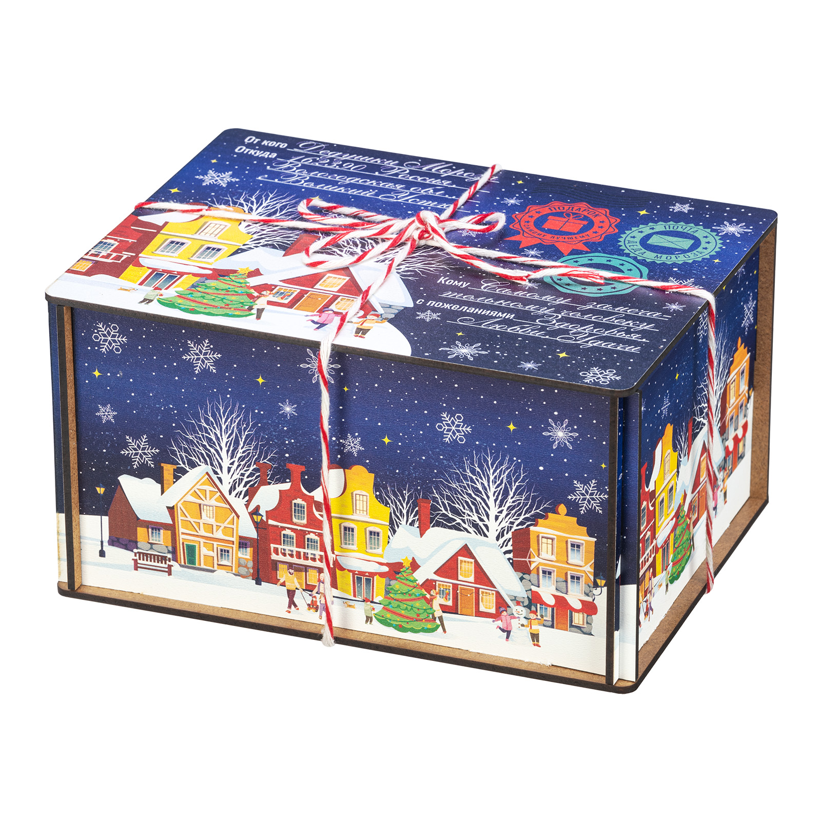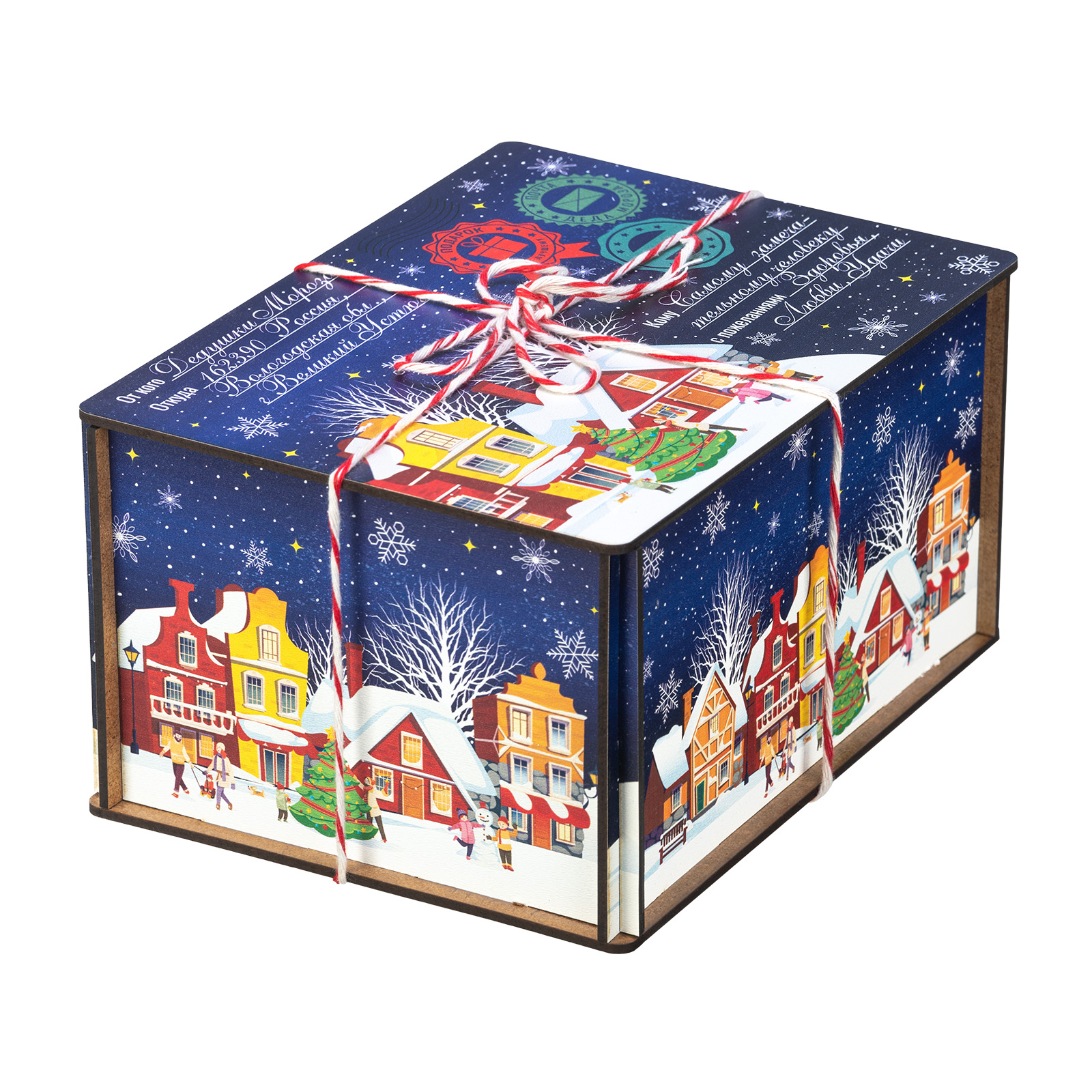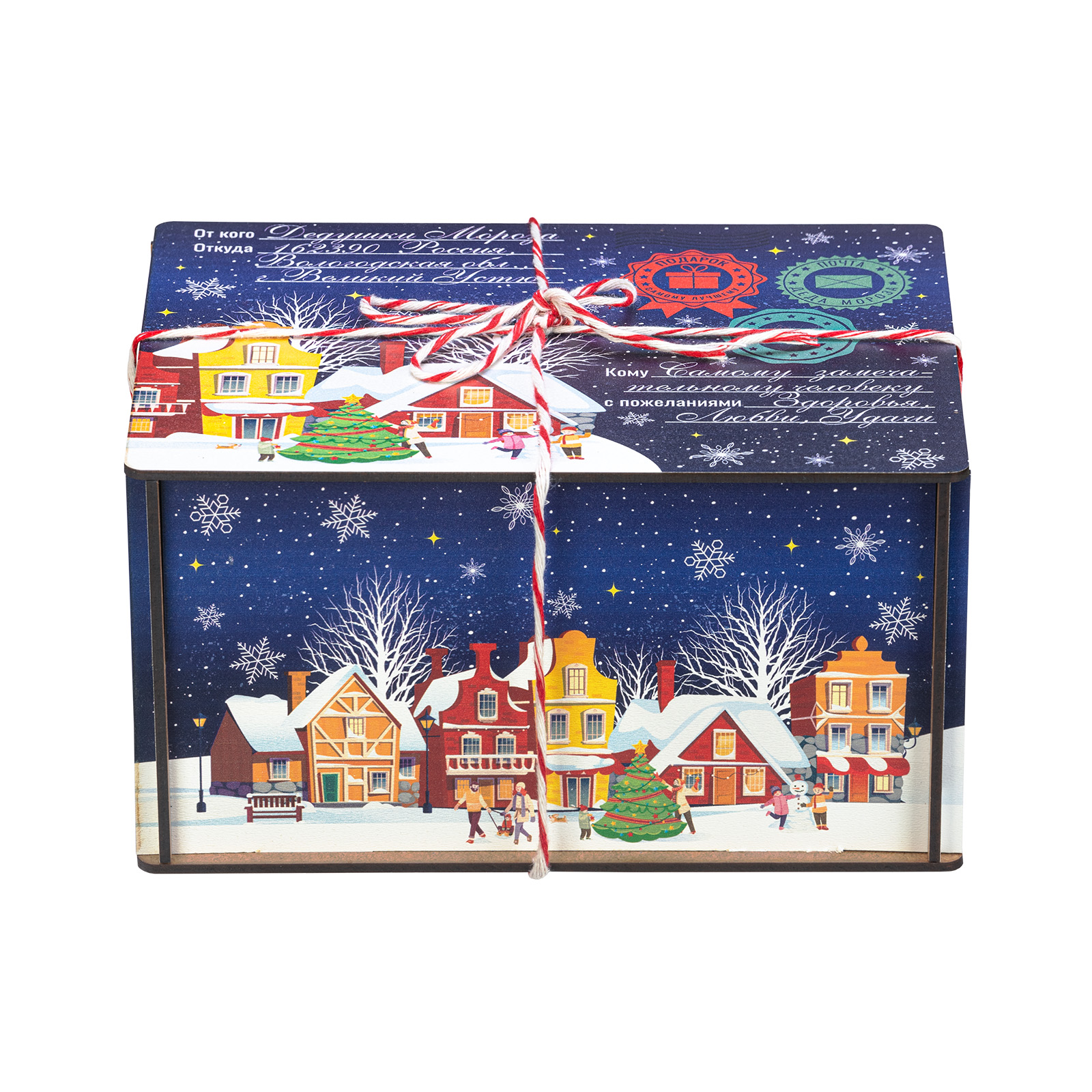 “Синяя ночь” - это новогодний сладкий подарок, который идеально в себе сочетает неповторимый вкус любимых сладостей и креативную оригинальную упаковку. Сладости бережно спрятаны в небольшой деревянный ящичек, украшенный со всех сторон разнообразными праздничными иллюстрациями в виде небольшого зимнего городка. Сверху упаковка закрыта удобной крышкой, оформленной в стиле посылки - посмотрите, даже фирменные печати есть! Внутри этого подарка находится килограмм разнообразных отборных сладостей и небольшой памятный сувенир. Такой подарочный набор универсален - его с легкостью можно вручить как взрослому, так и ребенку - восторг гарантирован в любом случае!