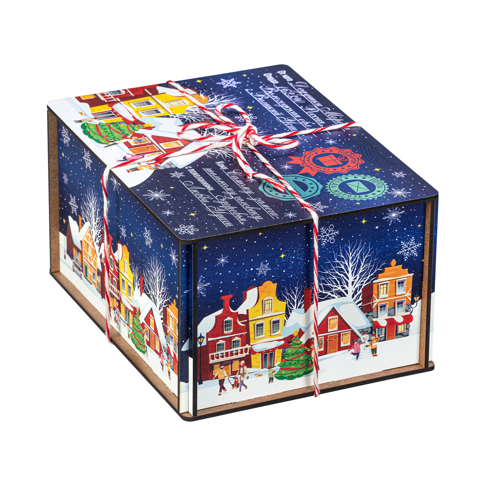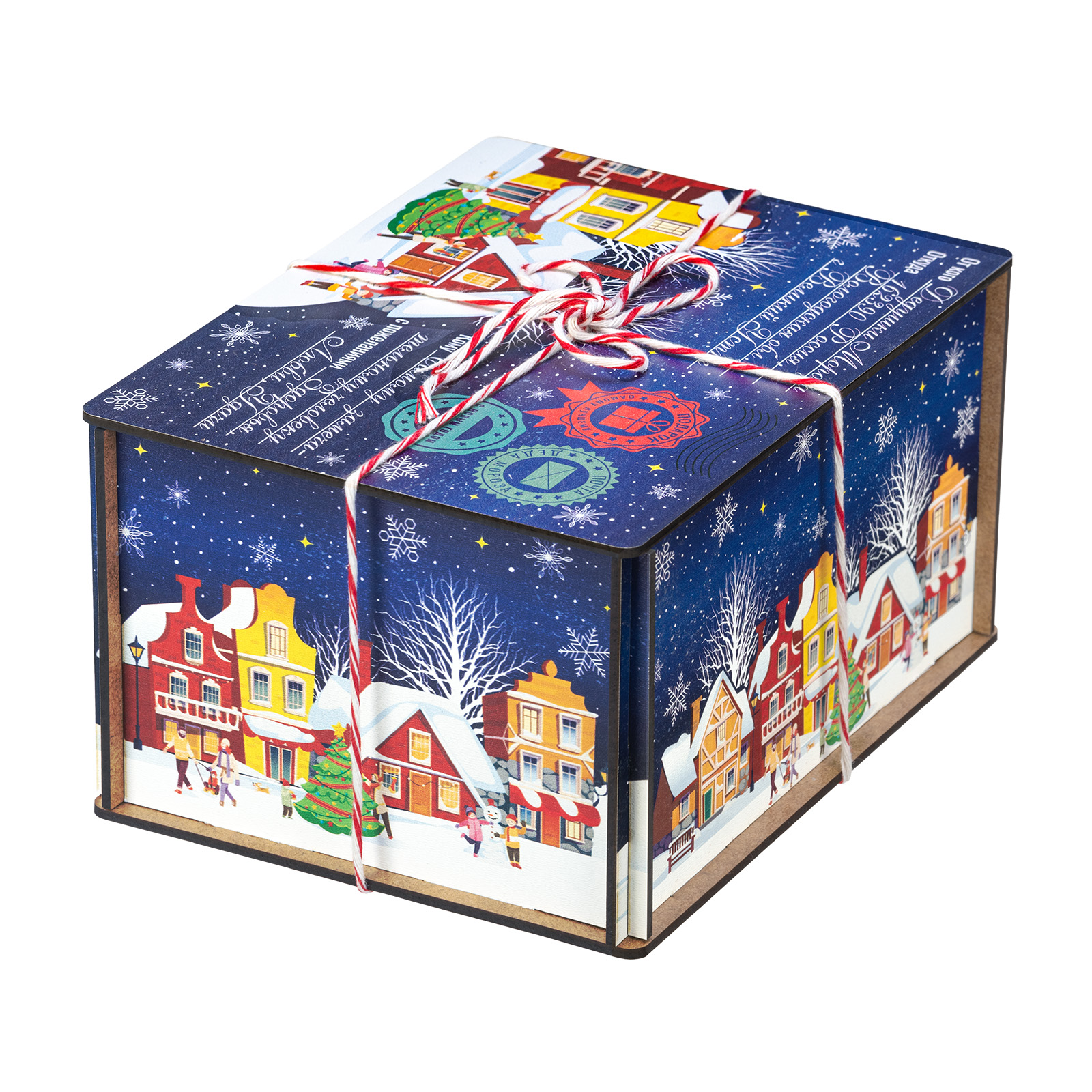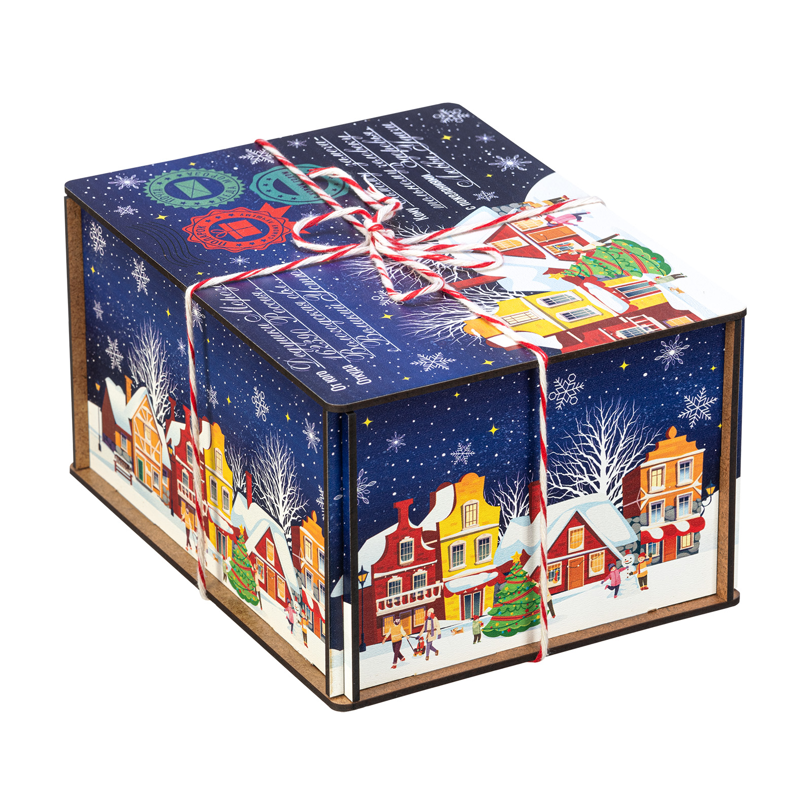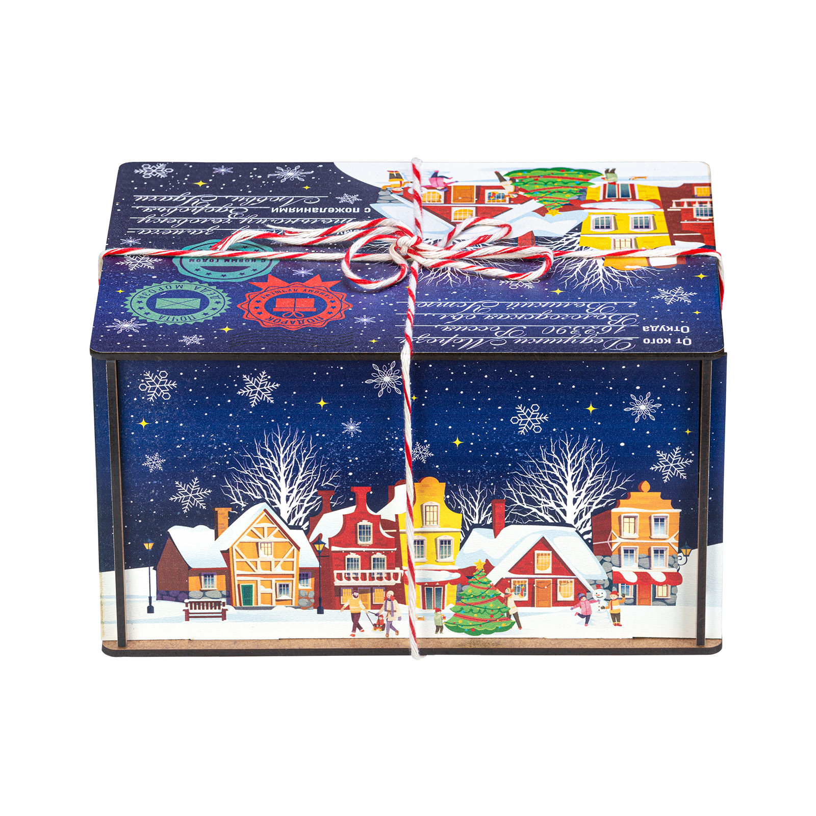 “Синяя ночь” - это новогодний сладкий подарок, который идеально в себе сочетает неповторимый вкус любимых сладостей и креативную оригинальную упаковку. Сладости бережно спрятаны в небольшой деревянный ящичек, украшенный со всех сторон разнообразными праздничными иллюстрациями в виде небольшого зимнего городка. Сверху упаковка закрыта удобной крышкой, оформленной в стиле посылки - посмотрите, даже фирменные печати есть! Внутри этого подарка находится килограмм разнообразных отборных сладостей и небольшой памятный сувенир. Такой подарочный набор универсален - его с легкостью можно вручить как взрослому, так и ребенку - восторг гарантирован в любом случае!